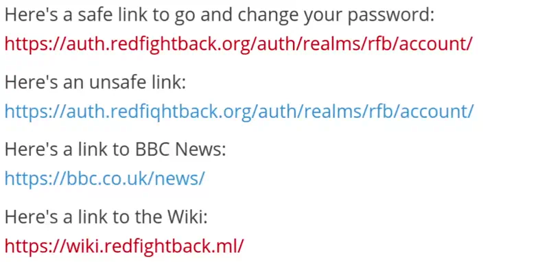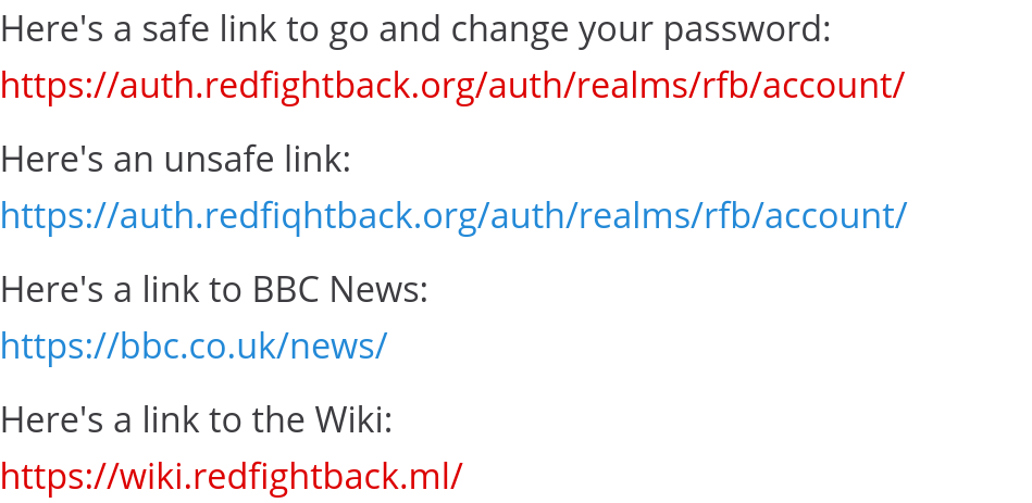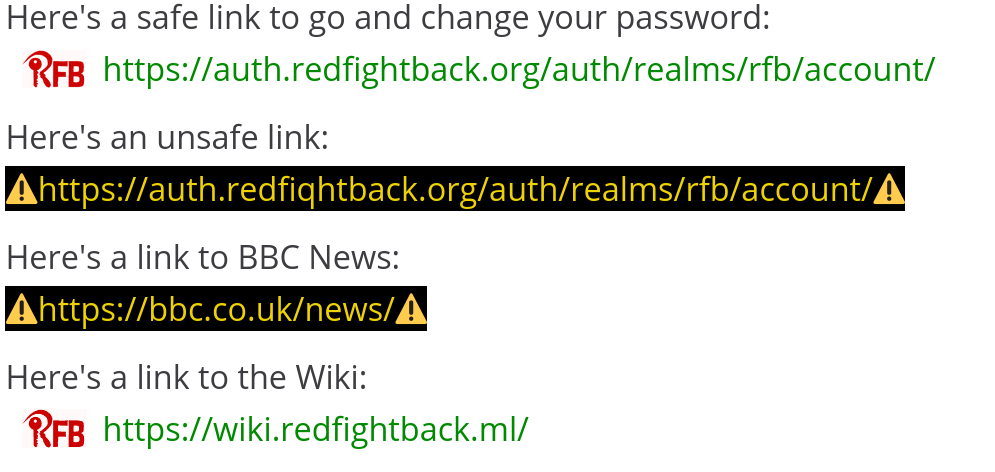 Comms now has a link safety feature to let you know if you’re clicking a link that takes you to a non-Red Fightback site. This is a protection against phishing attacks, to stop you accidentally clicking a link that looks like it goes to a service under our control when it doesn’t. It looks like this: